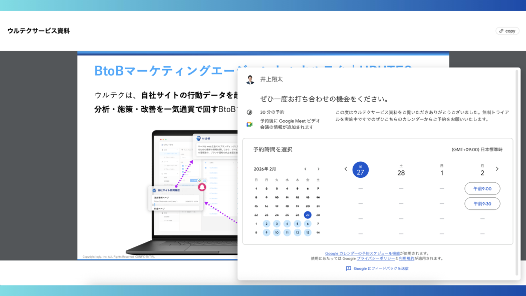 営業DMにスタジオURLを記載。リンクにアクセスした企業のインテントを即座に把握。スライド内に設置したカレンダーからシームレスに商談を設定でき、資料送付からアポイント獲得までの分断を解消します。